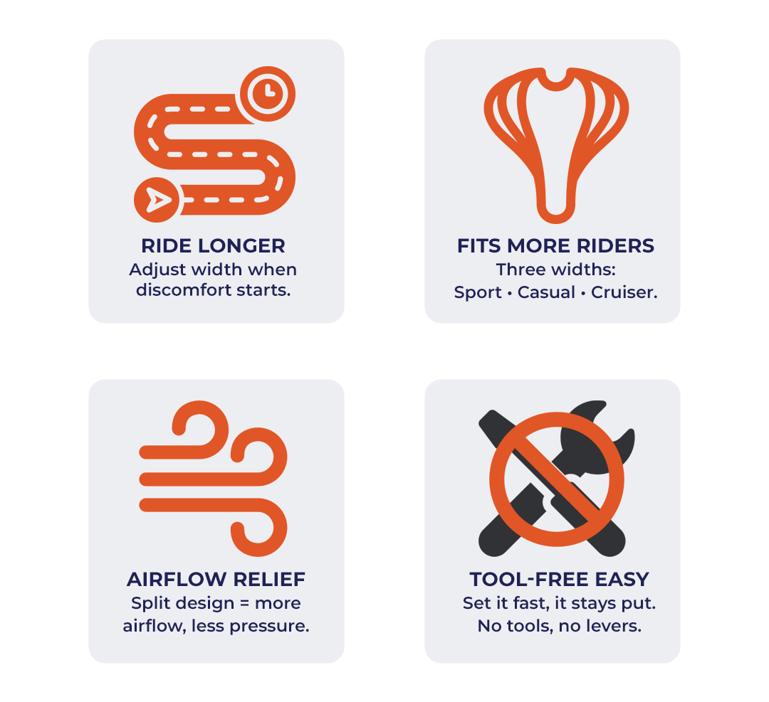 Each QuickSet width shifts sit-bone contact slightly, giving current hot spots a break while new areas take the load. Small changes go a long way toward easing pressure and extending comfort.